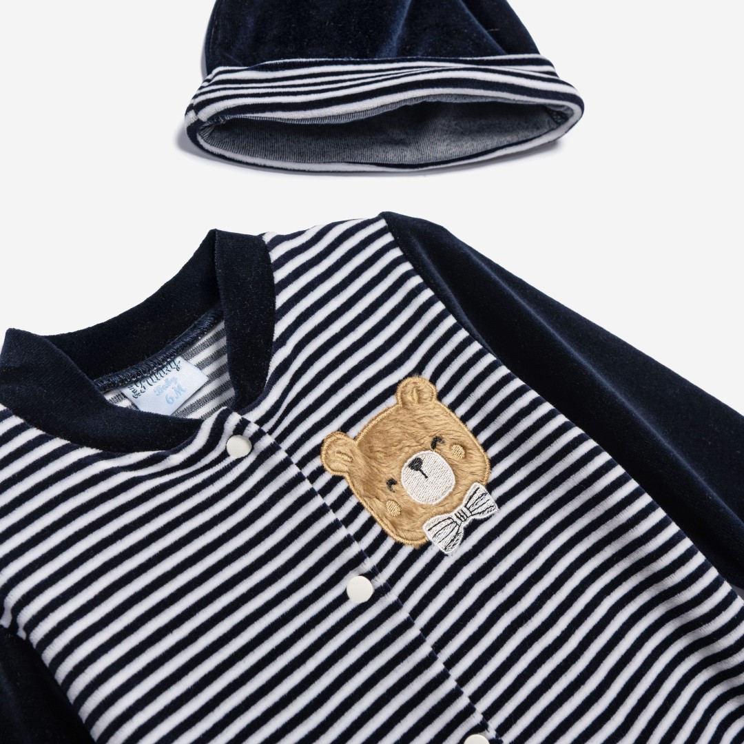 Φορμάκι μακρυμάνικο βελουτέ με τύπωμα και σκουφάκι σε χρώμα ριγέ μπλε βρεφανάπτυξη για αγόρι 0-24 μηνών.Σύνθεση 80% cotton – 20% polyester .