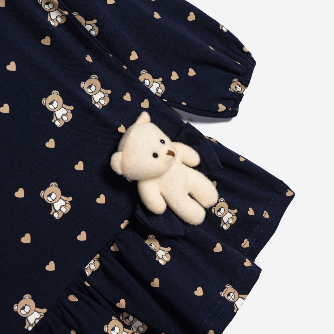 Φόρεμα κάλτσα λύκρα με τύπωμα (αρκουδάκια) allover και κούκλακι αρκουυδάκι για κορίτσι 6-24 μηνών σε χρώμα μπλε allover.Σύνθεση 95% cotton – 5% elastan