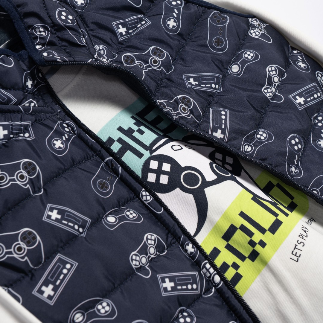 Σετ 3 τεμάχια τζάκετ αμάνικο για αγόρι 2-6 ετών με τύπωμα την μπλούζα και παντελόνι φούτερ σε χρώμα μπλέ/ σκούρο πράσινο/ μπλε.Σύνθεση 100% polyester +100% cotton+65%cotton-35%polyester