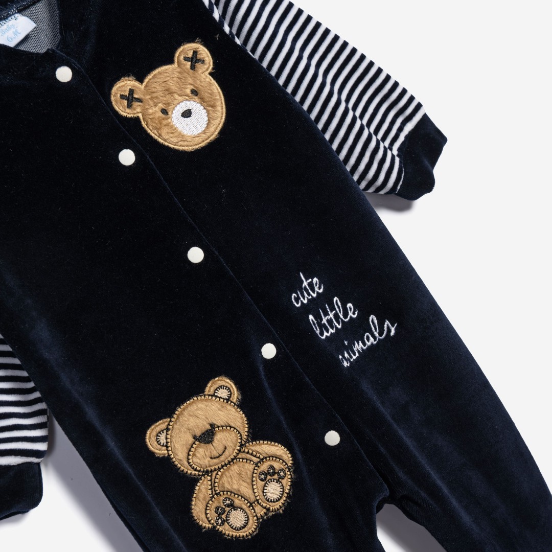 Φορμάκι μακρυμάνικο βελουτέ με τύπωμα και σκουφάκι με χρώμα μπλε ριγέ βρεφανάπτυξη για αγόρι 0-24 μηνών.Σύνθεση 80% cotton – 20% polyester .