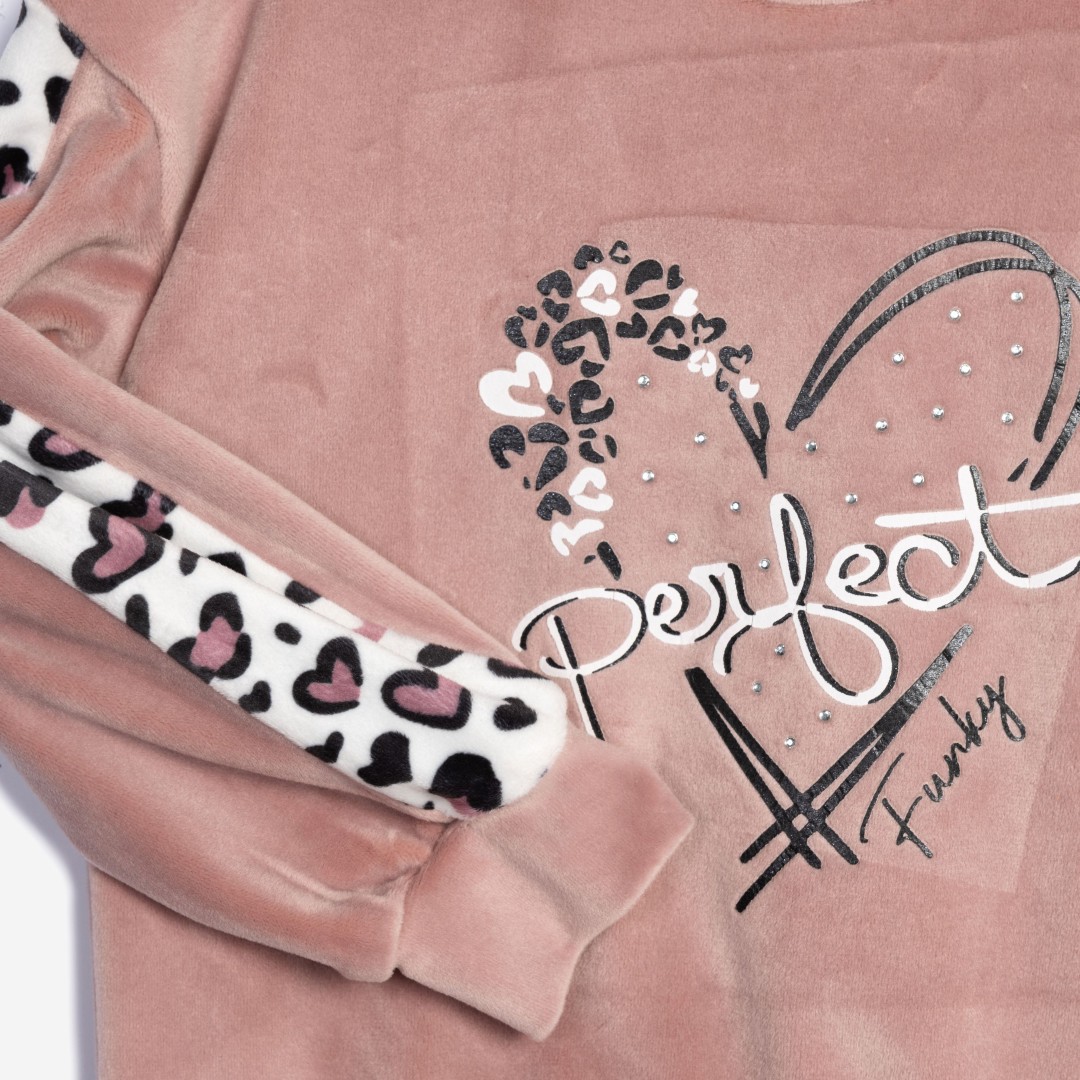 Φόρμα βελουτέ για κορίτσι 2-6 ετών σε χρώμα πούδρα- εκρού allover/ εκρού allover-πούδρα και λεπτομέρειες animal print. Σύνθεση